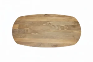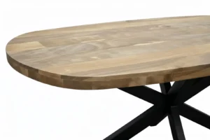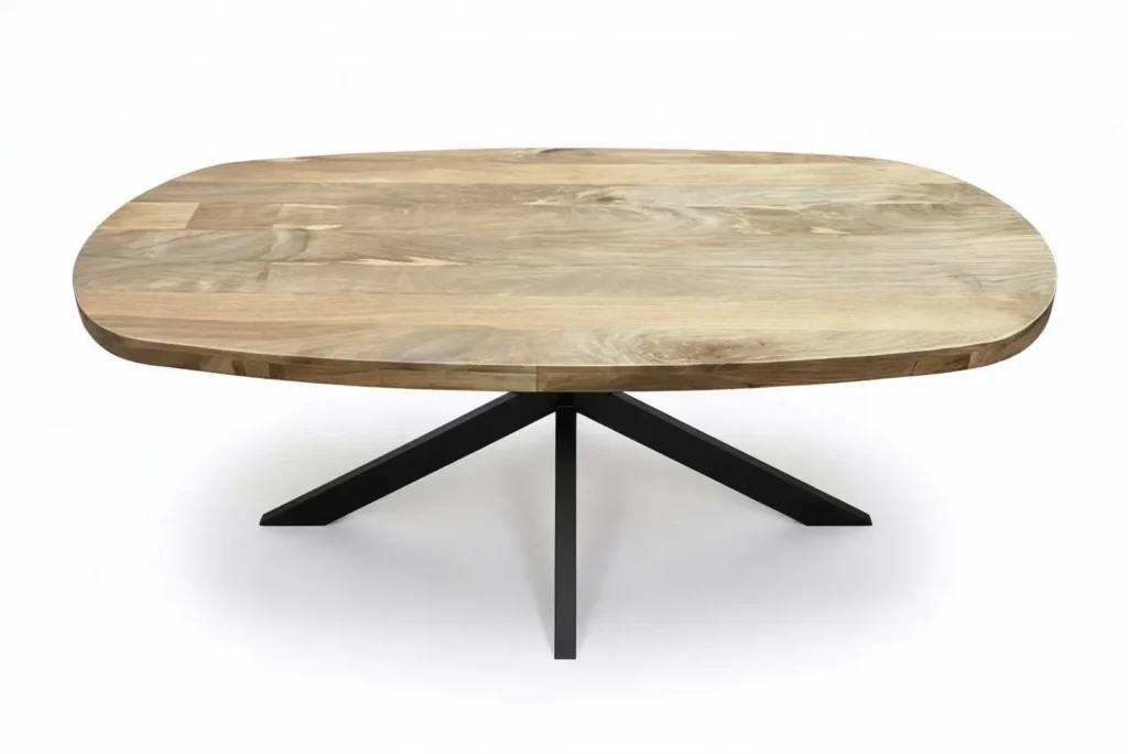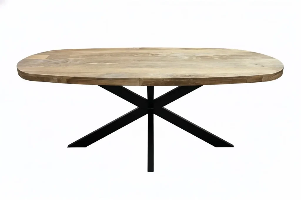 De Brennilis Eettafel combineert een organisch gevormd blad van massief mangohout met een zwart stalen spinpoot onderstel. De afgeronde hoeken en zachte lijnen maken hem vriendelijk om naar te kijken (en tegenaan te lopen), terwijl het onderstel juist heel grafisch en modern oogt.