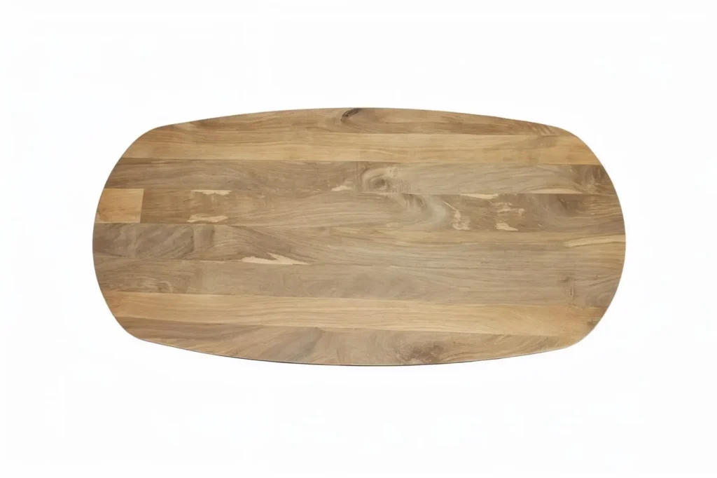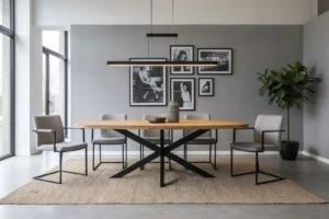 Deze tafel is geen “gewoon rechthoekig blad met poten eronder”, dit is een stuk dat meteen sfeer geeft aan de ruimte. Warm hout. Grafische poot. Gemaakt om aan te eten, te borrelen en te blijven hangen.