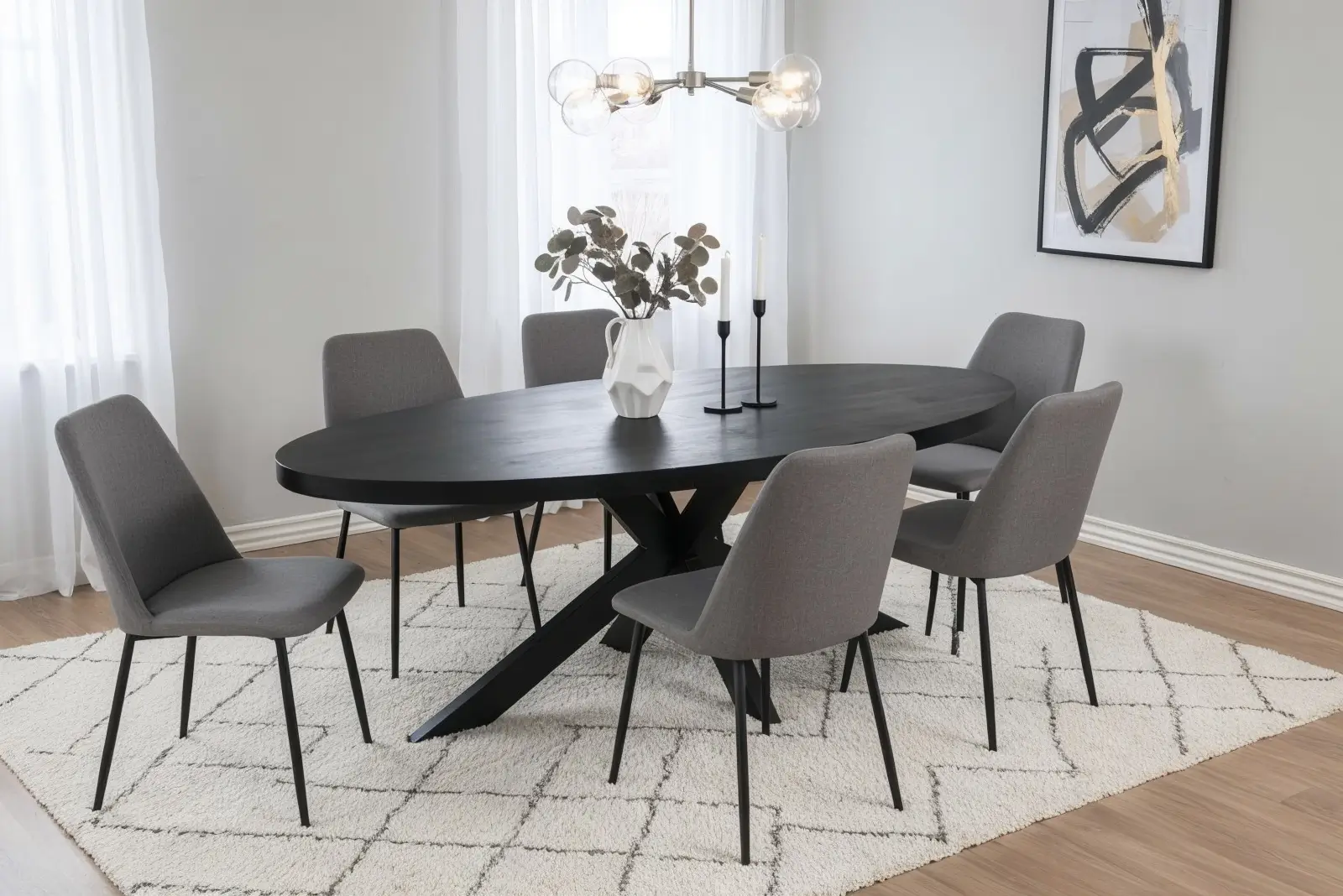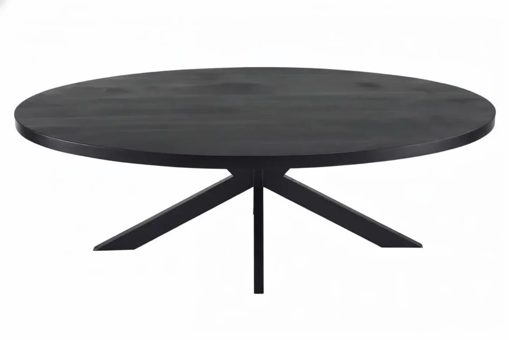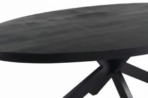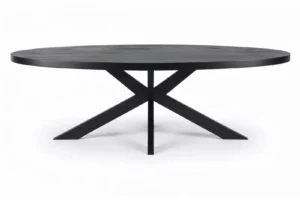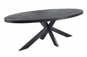 De Manigod eettafel in zwart is zo’n stuk dat meteen aanwezigheid geeft aan je ruimte. Het royale ovale blad van donker mangohout oogt luxe en karaktervol, terwijl het zware stalen onderstel de tafel visueel verankert zonder lomp te worden. Verkrijgbaar in meerdere lengtes (160 t/m 240 cm) zodat je precies kunt kiezen hoeveel plek je aan tafel wilt.