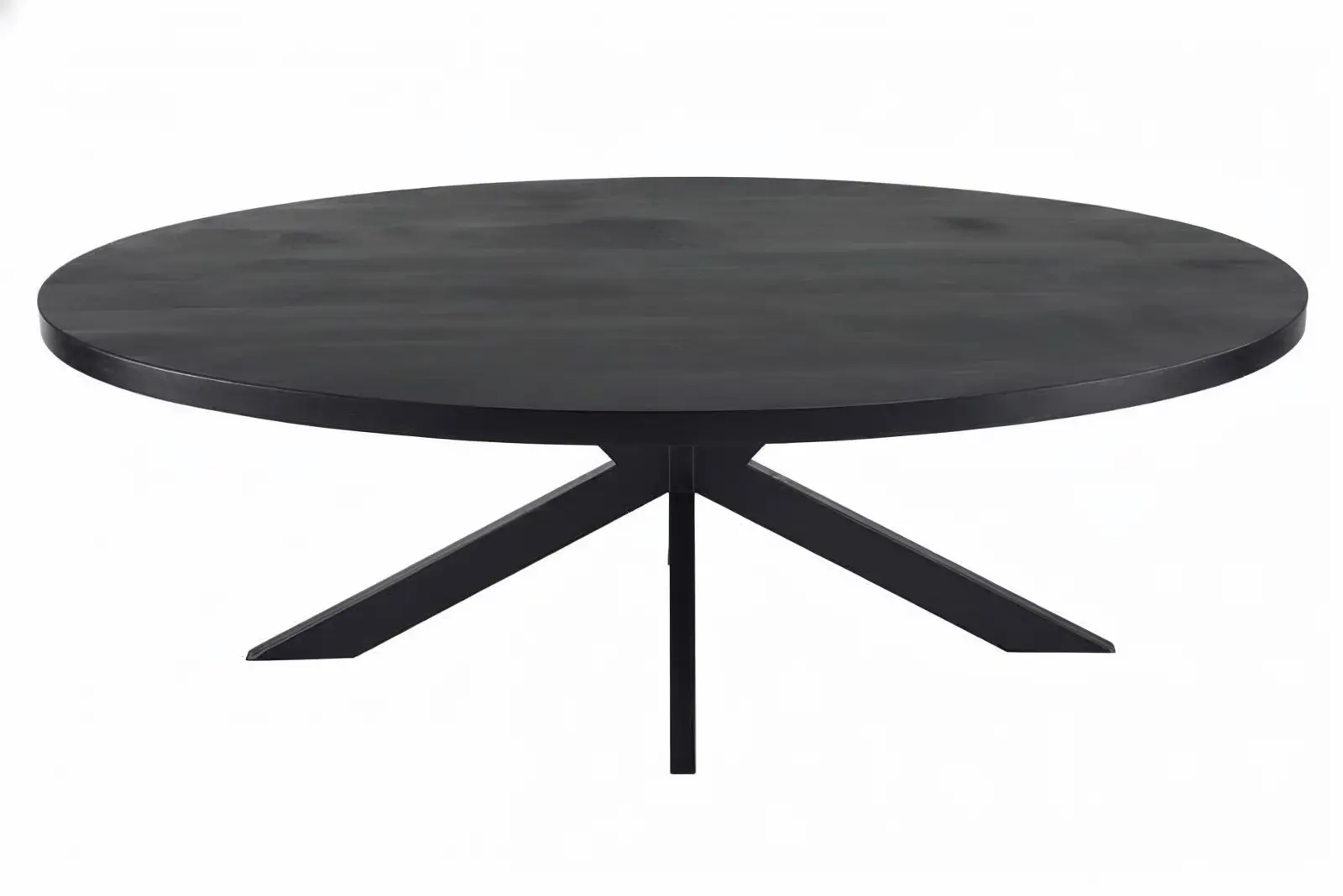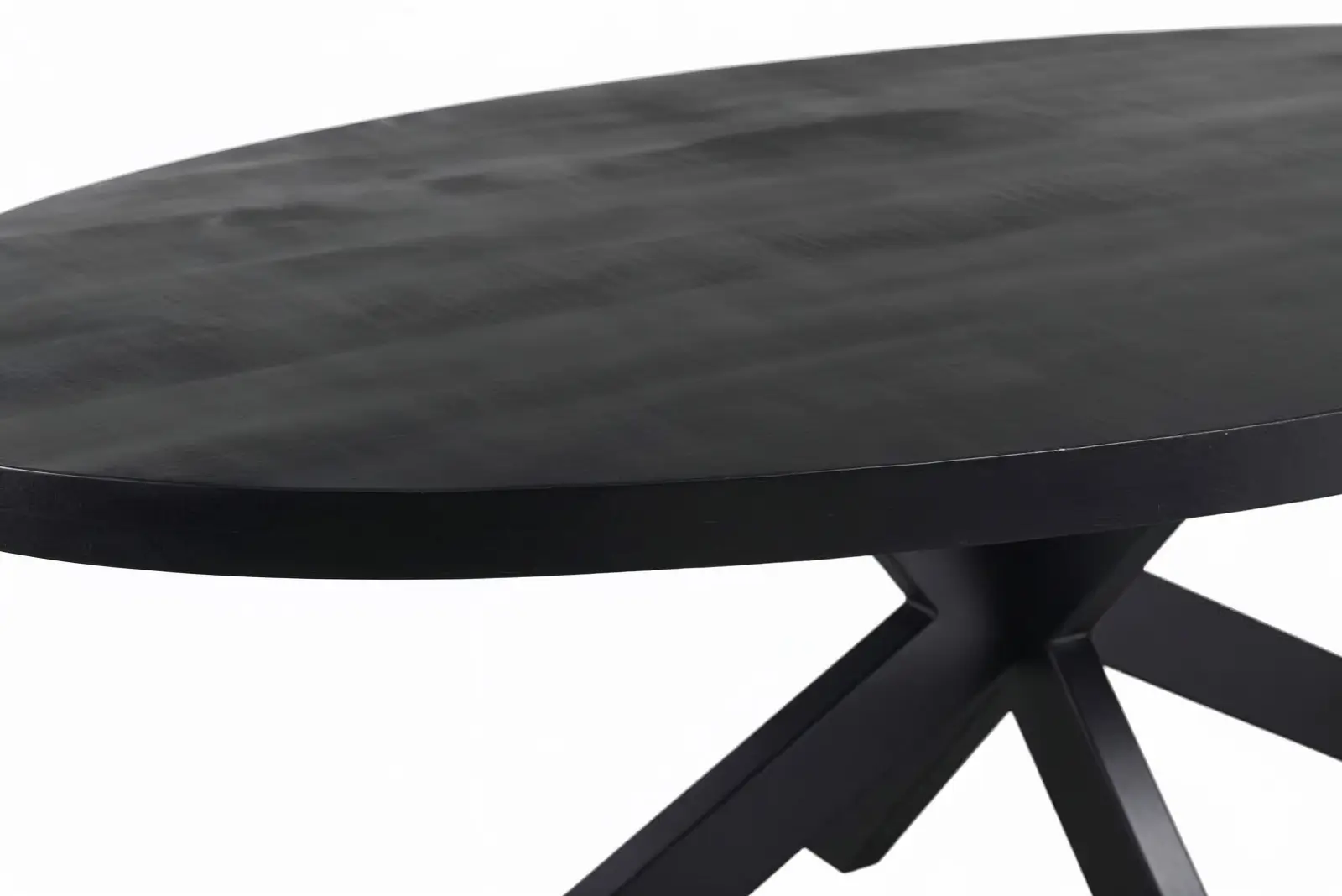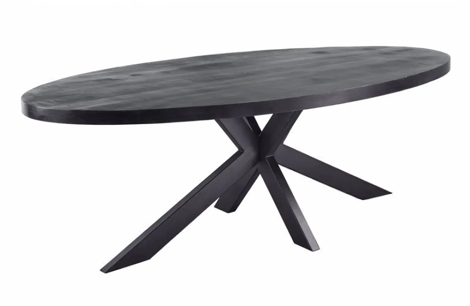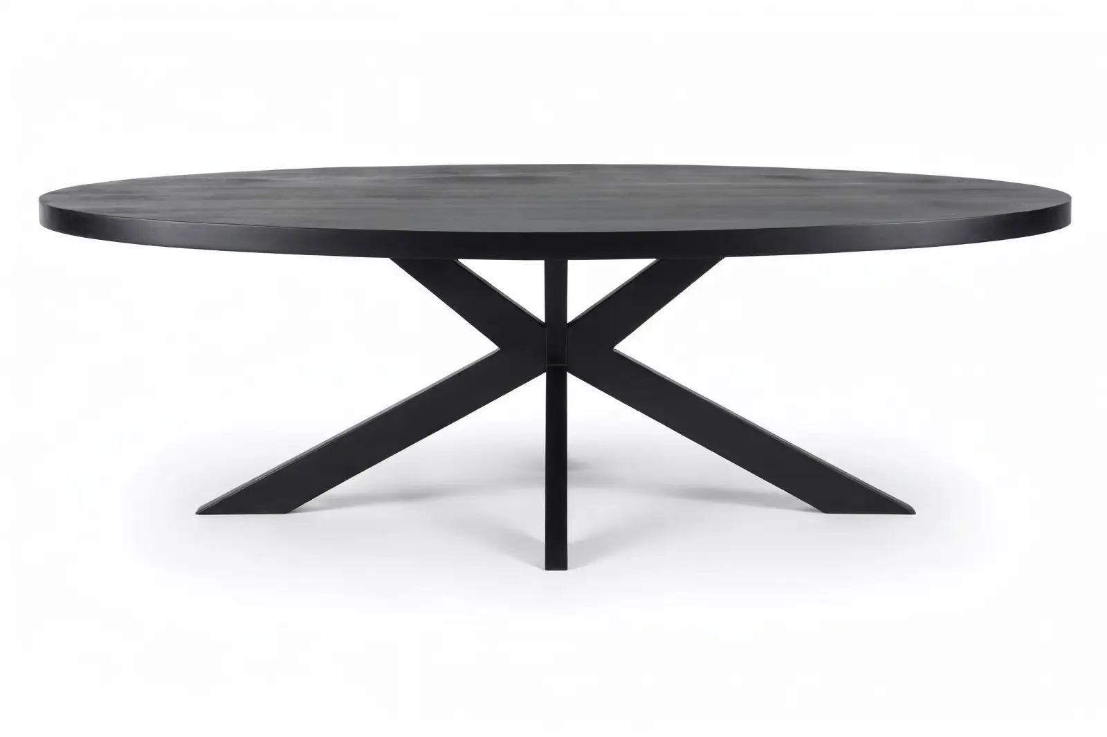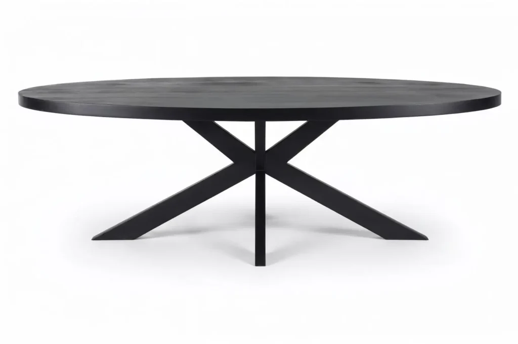 Diepzwart mangohout. Stoere industriële kruispoot. Gemaakt voor avonden lang tafelen.