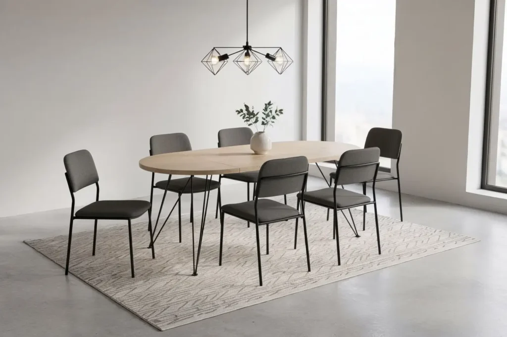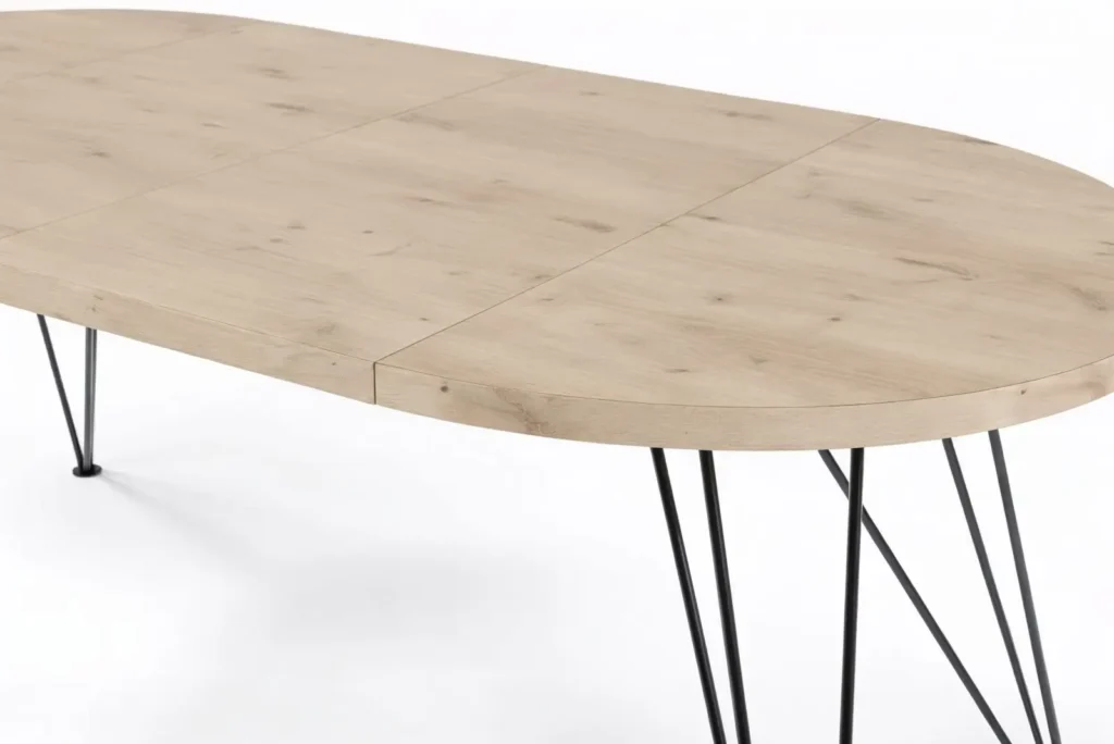Compact in het dagelijks gebruik. Ruimte om uit te pakken als er visite komt. Warme houtkleur, luchtig metalen frame, solide gevoel – de Orrouy is gemaakt voor woningen waar het leven zich afspeelt aan tafel.