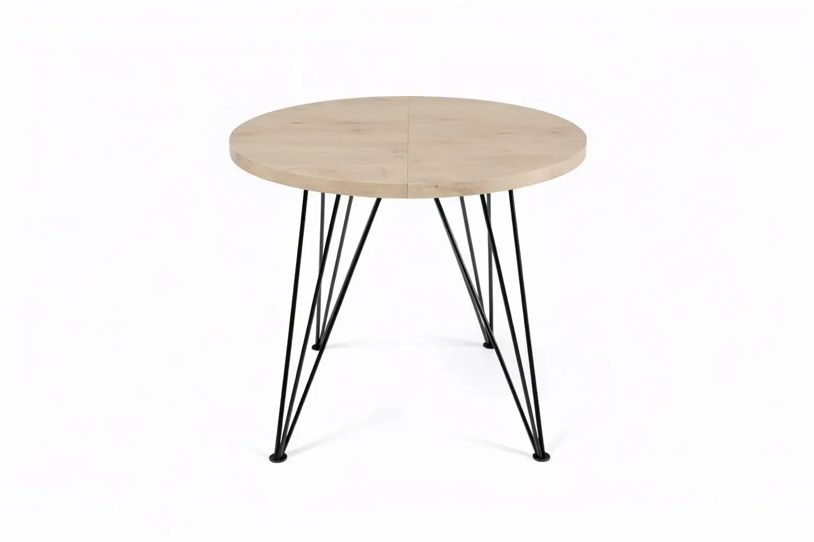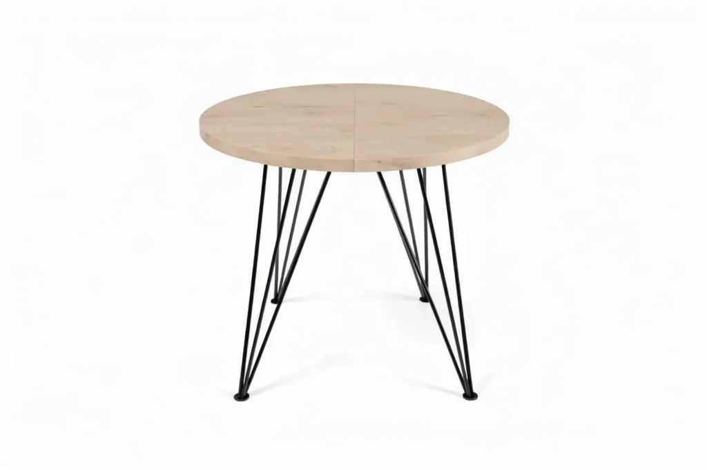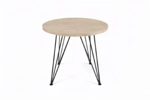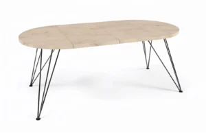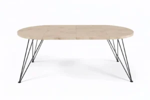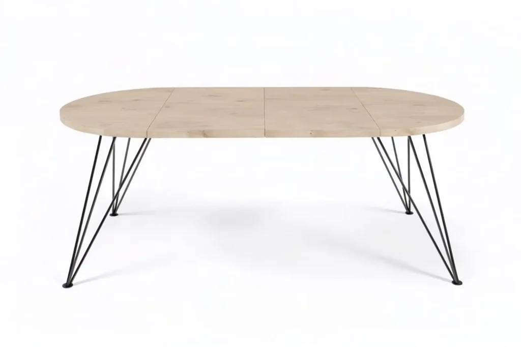 Het warme houtdecor in goud eiken brengt sfeer, terwijl het open metalen frame de tafel luchtig houdt. Dit is een blikvanger die past in een moderne keuken, lichte eetkamer of open woonruimte.