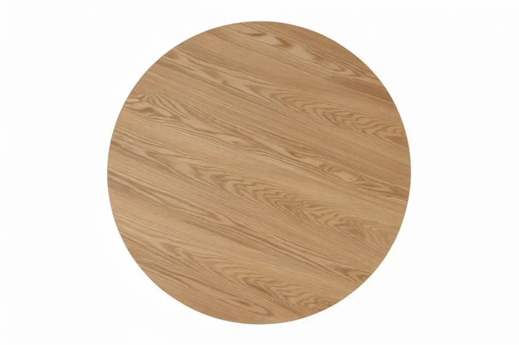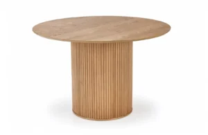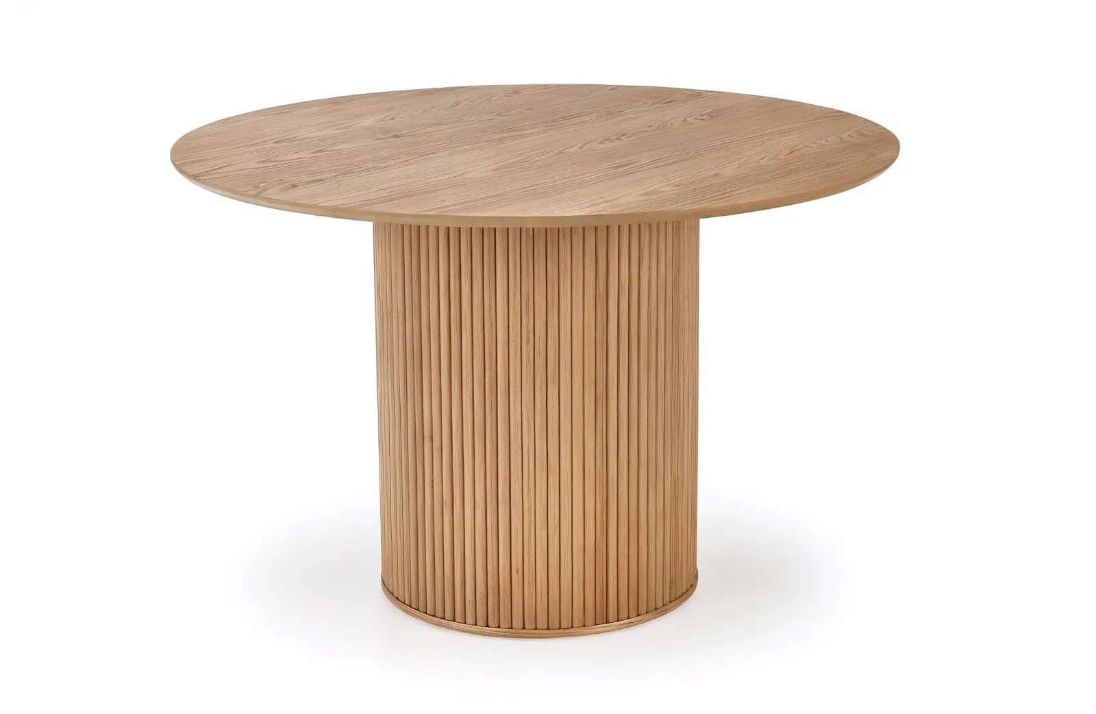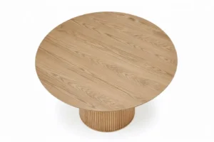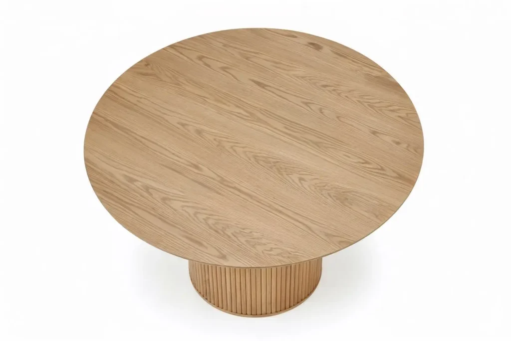De Propieres Ronde Eettafel combineert een slank houtkleurig blad met een geprofileerde kolomvoet van hout. De verticale latstructuur oogt rustig en luxe, terwijl het ronde blad de ruimte open houdt.